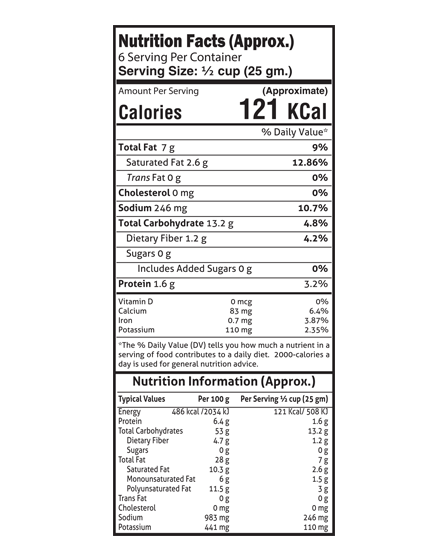 Potatoes (58%), Edible Vegetable Oil (Cottonseed oil and/or palmolein oil), Edible Common Salt, Ground spices (Red Chilli, Dried Ginger, Black Pepper, Cardamom), Acidity Regulator (INS330)