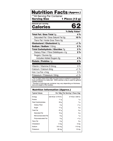 Wheat Flour, Sugar, Hydrogenated Vegetable Oil (Palm, Soybean, Sunflower & Sesame), Butter, Almonds (4.24%), Almond Essence & Butter Essence.