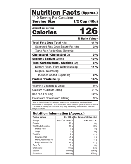 Split Green Gram (35%), Split Black Lentil (35%), Saji (Crude Sodium Carbonate), Iodized Salt, Black Pepper (1%), Edible Vegetable Oil (Palmolein Oil and/or Cottonseed Oil), Asafoetida.