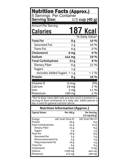 Split Chickpea (70%), Edible Vegetable Oil (Palmolein oil and/or cottonseed oil), Edible Common Salt, Chilli, Coriander, Ginger, Black Pepper, Cardamom, Clove