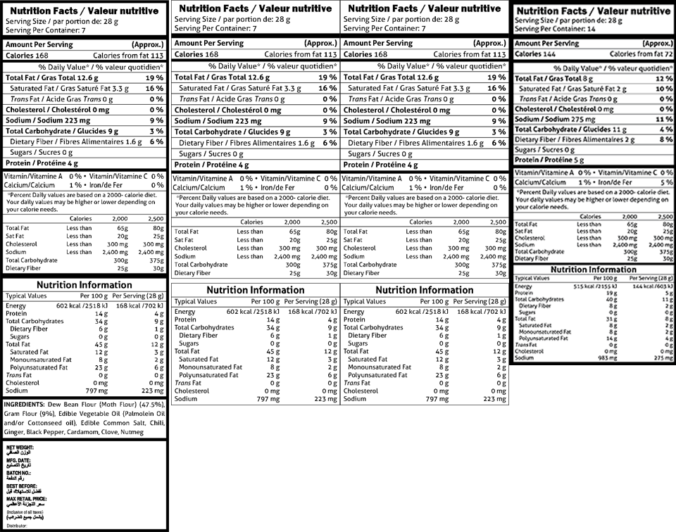 Sub Kuch (Navrattan): Edible Vegetable Oil (Plmolein Oil and/or Cottonseed Oil), Split Chickpea (30%), Whole Lentils(12%), Peanuts (8%), Dried Potato Slice (4%), Rice Flakes (3%), Gram Flour, Dew Bean Flour (Moth Flour), Tapioca Starch, Dehydrated Potato Flakes, Edible Common Salt, Ground Spices (Chilli, Turmeric (Colouring & Spice), Cumin , Ginger, Black Pepper, Cardamom, Clove, Dry Spinach Powder , Cinnamon, Mace, Nutmeg, Asafoetida, Acidity Regulator (INS 330))