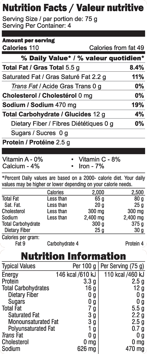 Tomatoes Paste, Whole Chickpeas, Onion, Clarified Butter, Palmolein Oil, Mixed Spices (Cumin Seeds, Black Pepper, Cardamom, Clove, Nutmeg, Cinnamon, Mace, Bay Leaf, Dry Pomegranate Seeds, Coriander&Chili Powder), Ginger, Green Chili, Iodised Salt, Cumin, Garlic, Coriander Powder, Coriander Leaves, Red Chili Powder, Asafoetida, Dried Fenugreek Leaves.